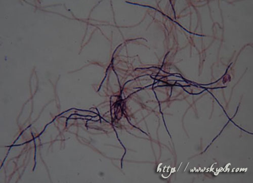 化脓部位的奴卡菌不能被HE染色,Gram染色可见分枝菌丝趋向于断裂为短的节段,犹如细菌,尤其像结核分枝杆菌,且奴卡菌也部分呈抗酸性,只是借其具有分枝菌丝而可与无分枝的结核杆菌相鉴别。