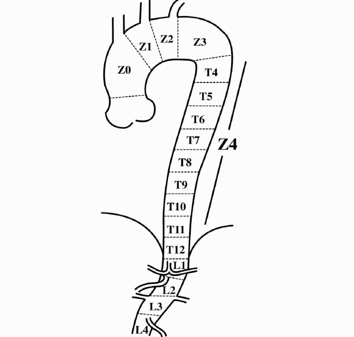 胸主动脉分区在胸主动脉病变的处理中是非常有用的临床分区,尤其是在动脉瘤、夹层等的腔内治疗方面有非常好的指导和随访作用。
