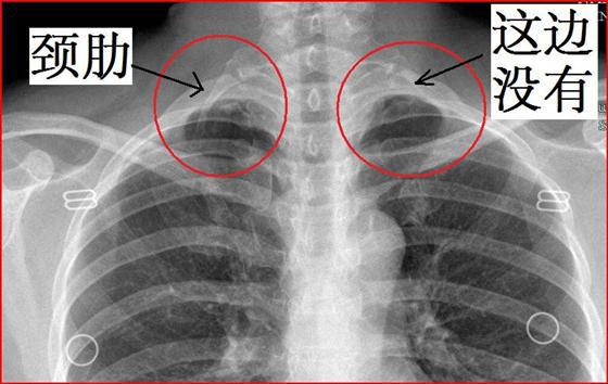 由于第7颈椎的横突异常增生,隆突形成肋骨,而使胸廓的出口狭小,以致出现神经和血管的压迫症状,此即颈肋综合征。劲肋综合征多见于中年人,因为人步入中年以后,颈肋软骨逐渐骨化,血管弹性差,胸廓出口的血管、神经容易受压。其临床表现主要有手臂疼痛,感觉异常,肤色苍白,手指发冷,患肢肌肉萎缩、软弱无力,其中以手掌尺侧小鱼际较明显。严重者可出现患肢瘫痪,感觉消失,甚至手指坏死现象。颈部触诊,可在患侧锁骨上凹中部触及质地较硬的肿块,在肿块下可以触及锁骨下动脉的搏动。如作颈椎X线摄片,可发现第7颈椎患侧横突异常,形成肋骨,即可明确诊断。