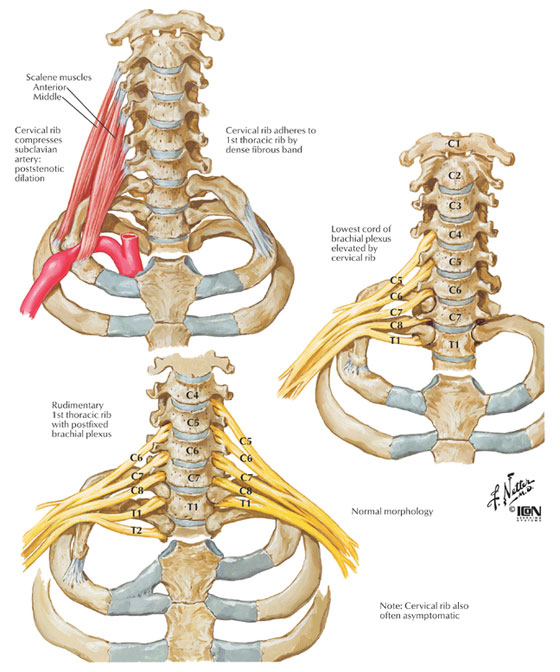 1、颈肋:第7 颈椎肋骨残存或横突过长,可改变出口的结构,易使臂丛跨越颈肋时受到压迫。有颈肋者不一定出现症状,只有出现症状者方需治疗。