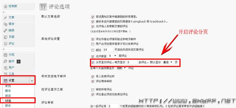 哦,还有一点要提醒一下的,一定要开启wordpress的评论分页功能,不然也见不到效果的,在后台的设置》》讨论中设置,打钩并根据页面大小情况选择合适的显示条数,具体如下面的截图: